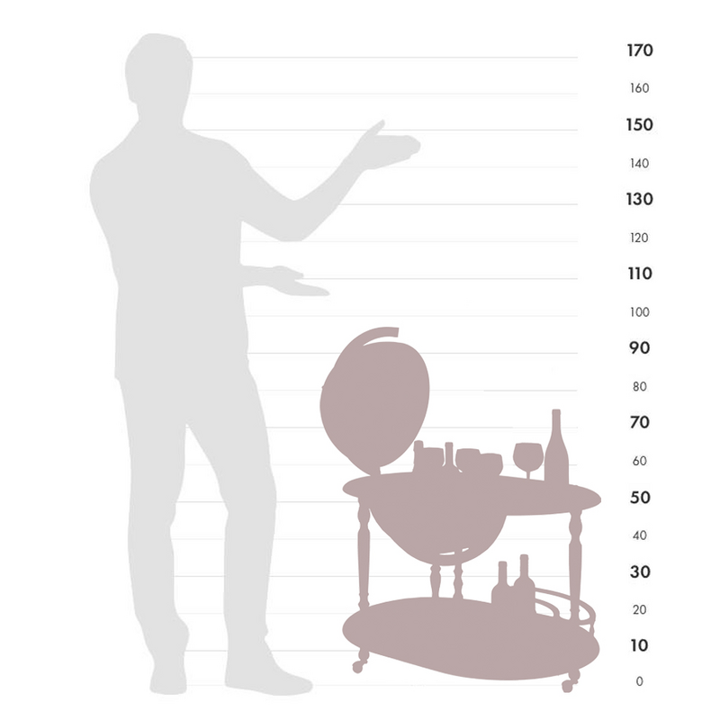 Sferos skersmuo yra 50 cm; viduje galite laikyti 2/3 butelių ir apie 9 taures. Kitus butelius galite padėti apatinėje lentynoje, o viršutinė lentyna aplink sferą bus patogus paviršius gėrimams ruošti.