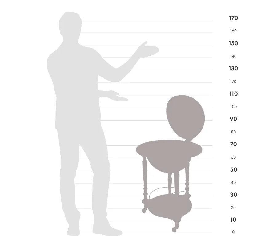 - Konstrukcija: 3 spiralinės kojelės iš buko medienos, šiaurinis dienovidinis, vidinis butelių laikiklis, ratukai.