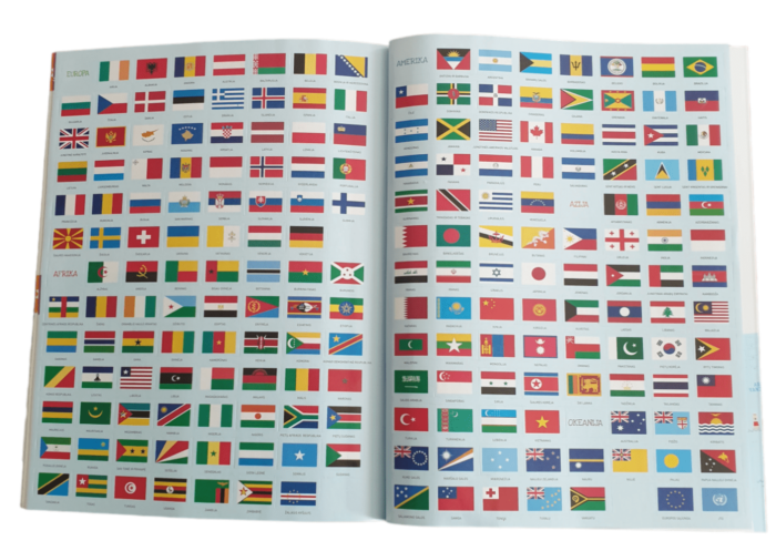Knyga 200 pasaulio šalių vėliavų su išimamomis kortelėmis, plakatu ir lipdukais