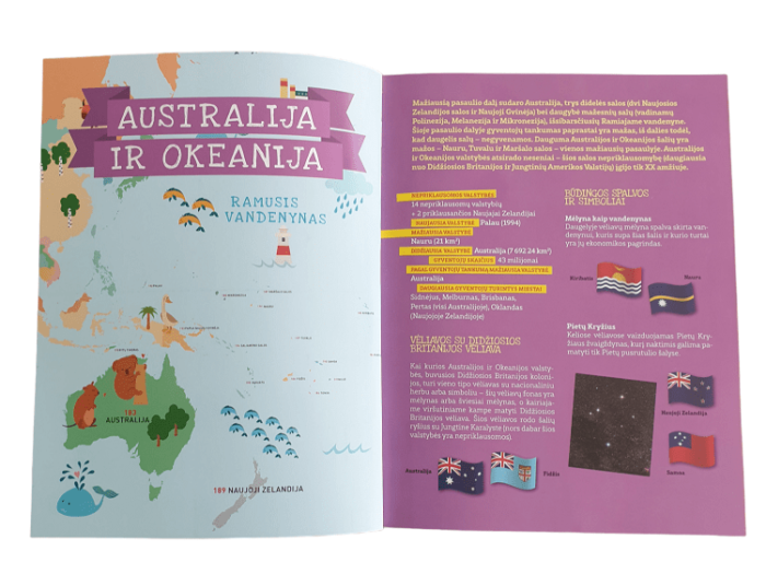Knygoje taip pat rasite didelį spalvotą plakatą – pasaulio žemėlapį, kuriame galėsite klijuoti vėliavėlių lipdukus.