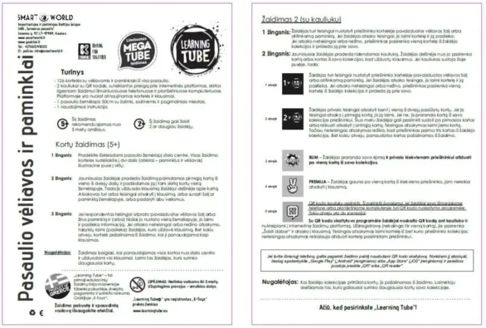 * 1 kubas, kuriame yra QR kodas prieigai prie internetinio žiniatinklio programa, kurią galima naudoti per išmanųjį telefoną ar planšetinį kompiuterį, naudojant duomenų bazę, kuri nuolat