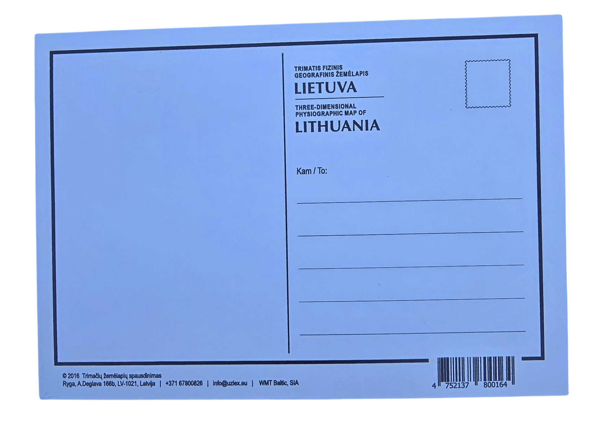 Unikalus trijų matmenų fizinis-geografinis Lietuvos žemėlapis – atvirukas, kuris ne tik papuoš Jūsų kolekciją, bet ir taps puikia dovana kelionių, geografijos ar Lietuvos mylėtojui.